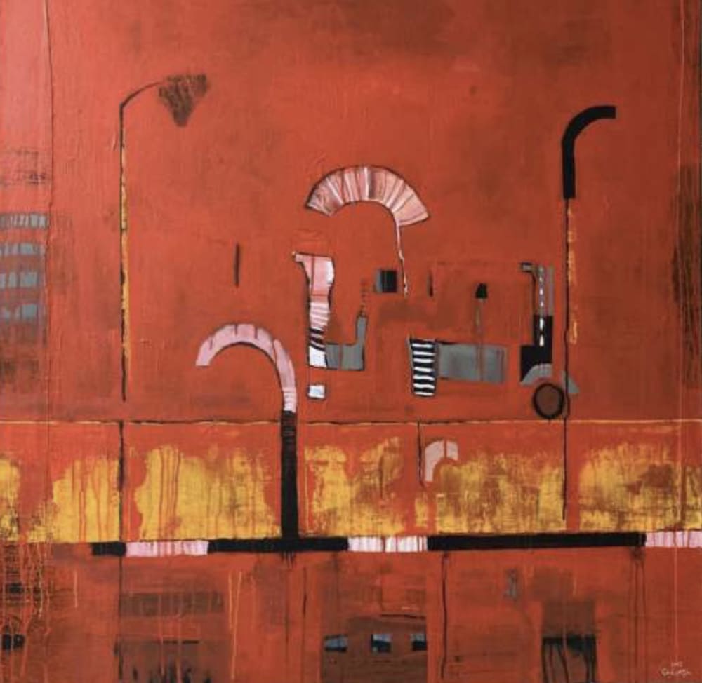 This 2012 acrylic-on-canvas by Saudi artist Abdulrahman Alsoliman uses warm reds and yellows with abstract architectural forms, evoking desert landscapes and aged city walls, blending heritage with a modern, textured style.