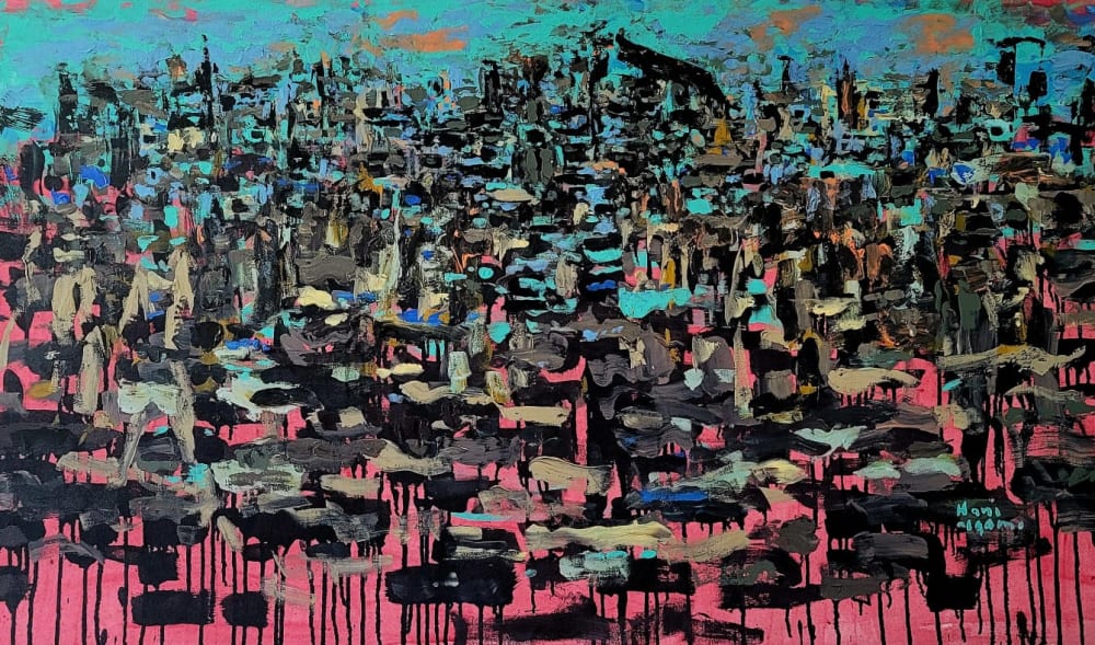 “When the Sky Fills the Windows” (2024) by Jordanian artist Hani Alqam is an acrylic on canvas that portrays the erasure of Gaza's landmarks. Using layered blacks, grays, and flashes of turquoise and pink, Alqam dissolves urban forms into drips and fragments, leaving only traces against an expansive sky. The work suggests absence and disorientation, capturing how destruction can strip a place of its memory and shape.