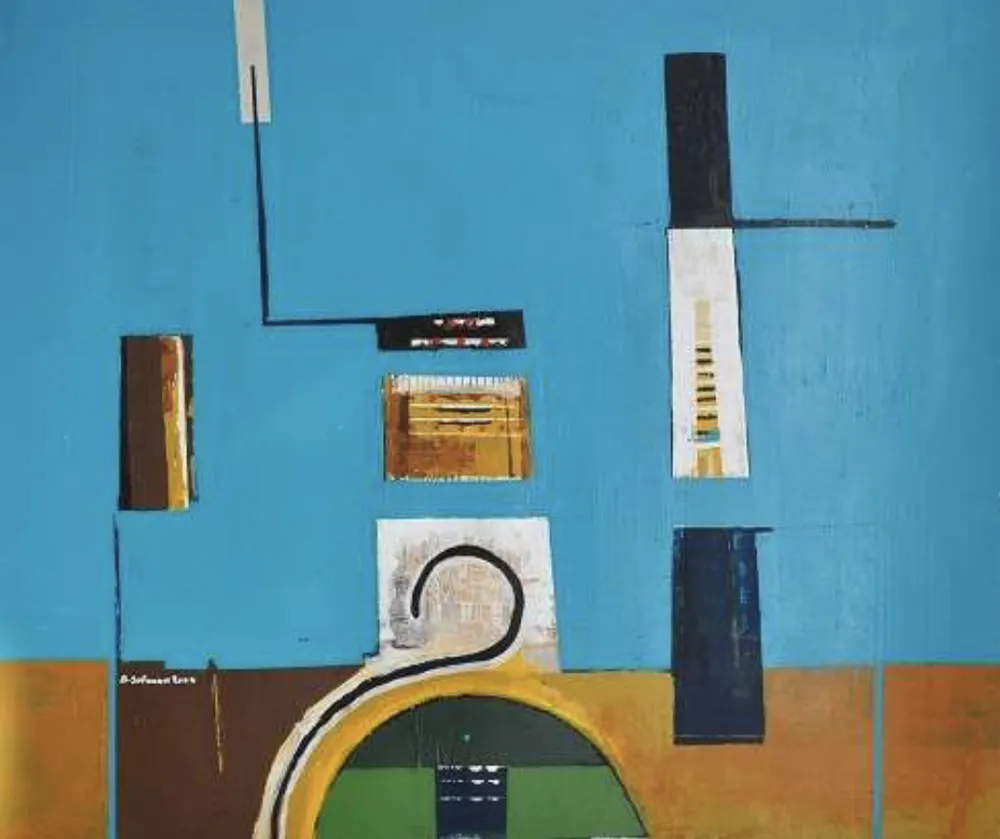 This painting by Saudi artist Abdulrahman Alsoliman, born in AlAhsa, presents a vivid composition of turquoise blue, earthy browns, and golden ochres. Geometric blocks and a sweeping curved line create balance between structure and flow, suggesting stylized landscapes or architectural fragments. The clean forms and layered textures highlight Alsoliman's modern abstract style, infused with echoes of his homeland’s colors and spatial rhythms.